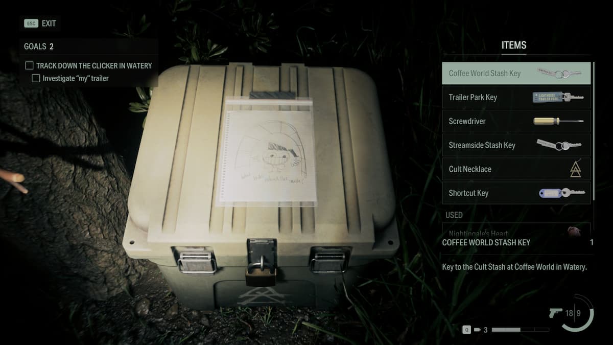 Once you spot the ginormous mug, go ahead and walk around the side of it until you can go behind it. Here, you will find the Coffee World Stash Key and can make your way back to the chest. Unlocking the chest, players will earn crossbow, pistol, and shotgun ammo. What’s more, a note will be on the inside of the chest, much like the rest of them you’ll find.